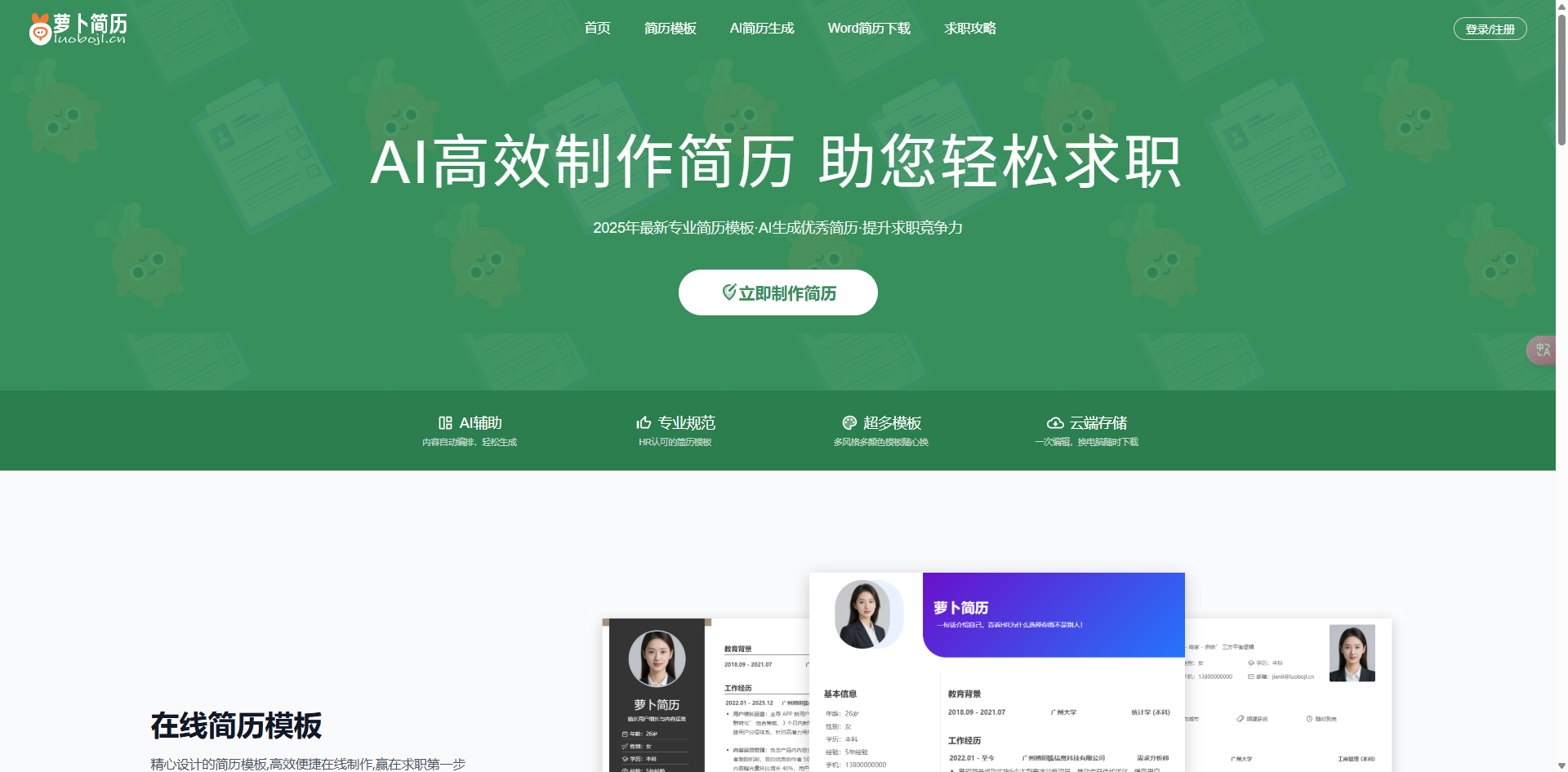 还在为写简历发愁?空白文档不知从何下笔、模板格式错乱、内容不贴合岗位需求…… 别让简历成为你求职路上的绊脚石!萝卜简历 ——AI 在线简历生成平台,专为应届生和求职者打造,从模板到内容,从制作到管理,一站式解决简历难题,让你轻松拥有高竞争力简历!