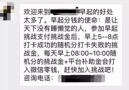 而今,这种模式早已被搬到互联网上。以往更多的是各种跑步圈、减肥圈的各种群。同样的模式:也是每天每个人都上缴一定的群费给群主代收,每天早上规定的时间在群里面打卡,按时打卡的人都会有相应的红包,没有按时打卡的人当天的群费就给大家平分了,每天如此。